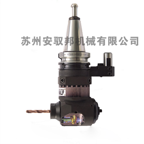 1、輕型角度頭——此類角度頭特點為質量輕(一般5-15kg,市場上甚至有3kg的超輕型)、精度高、扭矩偏小、可進刀庫進行自動換刀。此類角度頭用定位塊定位,輸出一般為筒夾或BT30錐柄,有時也有特殊的可以輸出CAT或HSK刀柄,也有部分特殊的直接連接絲攻或面銑刀。